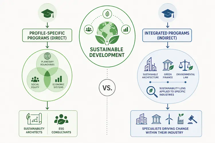The Difference: Direct programs offer the “big picture” along with systemic tools, whereas integrated programs provide “vertical expertise” in a certain domain. Choosing between them depends on whether you want to lead sustainability strategy or implement it within a technical field.