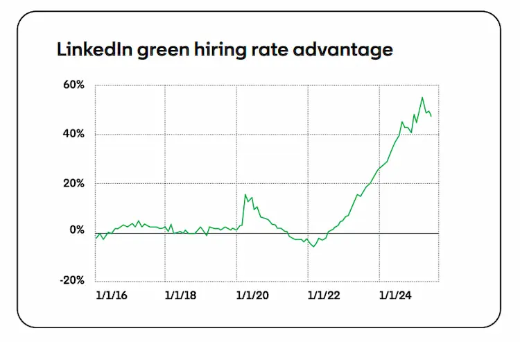 Hiring Premium: LinkedIn data shows that professionals with green skills are over 50% more likely to be hired, reflecting a significant talent gap in the labor market.